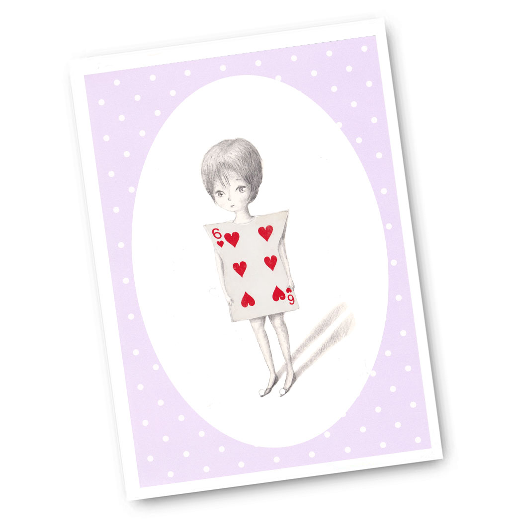 art, cute, drawing, etsy, girl, illustration, love hearts, pink, playing cards, red, sad, whimsical art